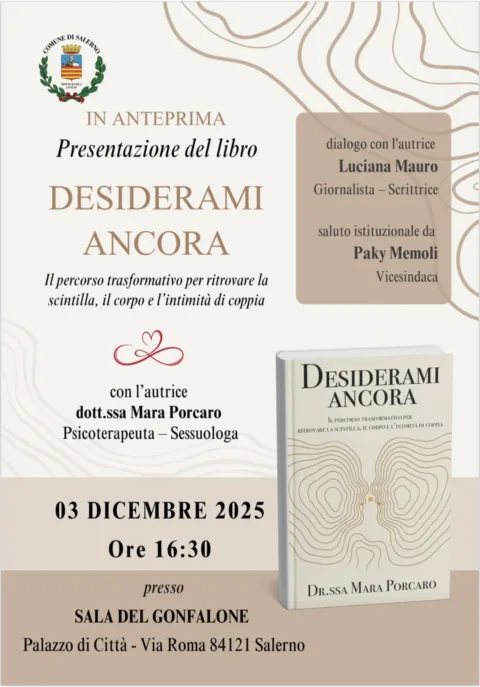 Lunedì 1 dicembre 2025, alle ore 10.30, presso Sala del Gonfalone del Palazzo di Città, si terrà la conferenza stampa di presentazione di "Desiderami Ancora", il nuovo libro di Mara