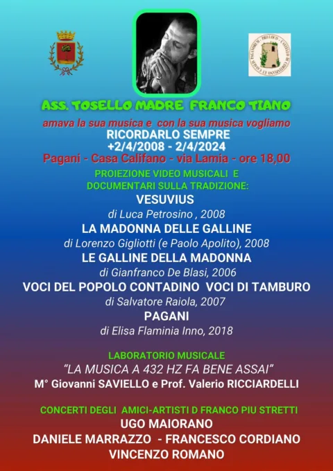 Il giorno 2 aprile alle ore 18:00, presso Casa Califano, in via Lamia ci sarà un evento in ricordo di Franco Tiano organizzato dall'associazione Tosello Madre Franco Tiano, per ricordarlo