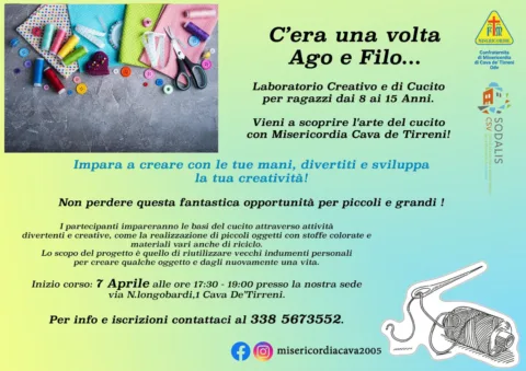 Con Sodalis organizzano, il laboratorio creativo: C’era una volta… ago e filo. Il Laboratorio è diretto principalmente a ragazzi dagli 8 ai 15 anni, che potranno condividere la loro creatività