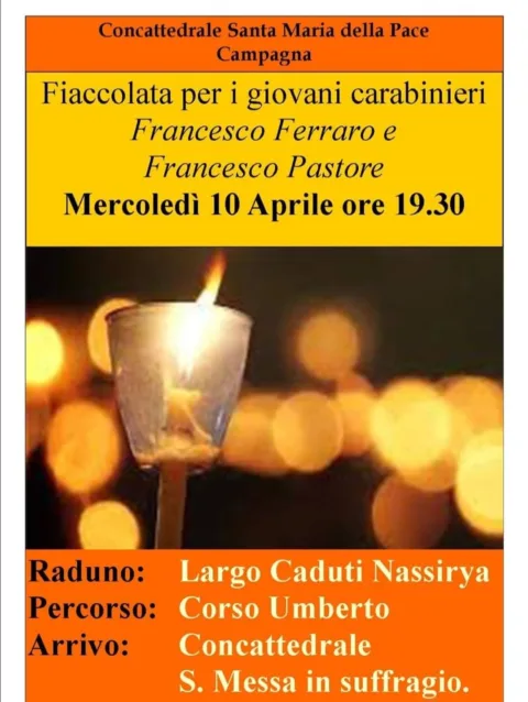 Mercoledì 10 aprile con la Concattedrale Santa Maria della Pace in Campagna alle ore 19:30, ci sarà la fiaccolata per Francesco Ferraro e Francesco Pastore, carabinieri rimasti vittime di