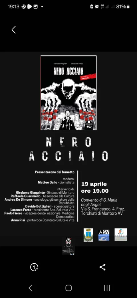 Venerdì 19 aprile alle 19:00 presso il Convento di S. Maria degli Angeli ci sarà la presentazione del fumetto 'Nero Acciaio'. Saranno presenti il Sindaco di Montoro Girolamo Giaquinto e