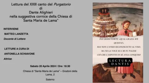 Nella Chiesa di Santa Maria de Lama a Salerno, Sabato 20 aprile alle ore 18:30, ci sarà la lettura del 23° canto del Purgatorio di Dante Alighieri a cura dell'attrice