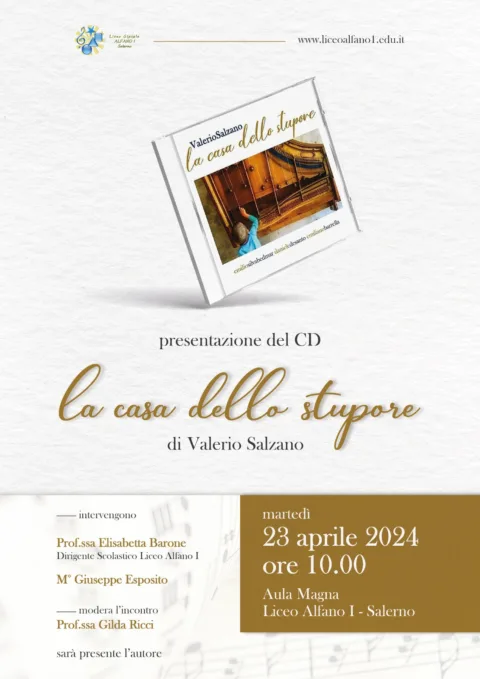 Martedì 23 aprile alle ore 10:00, presso l'Aula Magna del Liceo Alfano I, ci sarà la presentazione del CD di Valerio Salzano 'La casa dello stupore'. Sarà presente l'autore L'evento
