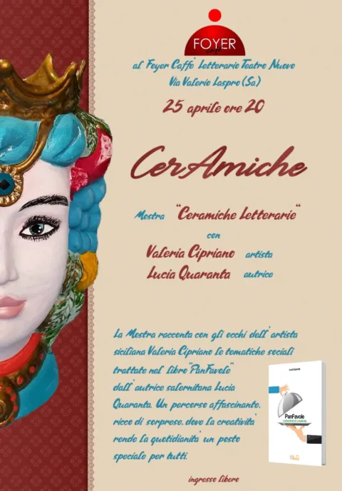Incontro di arti ed artiste, la scrittrice Lucia Quaranta e la ceramista scultrice, Valeria Cipriano, presenteranno giovedì prossimo 25 aprile, alle ore 20, nel foyer caffè letterario di via Laspro