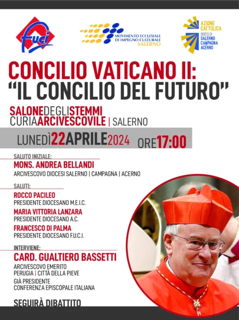 L'incontro è promosso dalle Presidenze Diocesane del M.E.I.C., FUCI ed AC. Al meeting parteciperà S.E. Cardinale Gualtiero Bassetti, Arcivescovo Emerito di Perugia-Città della Pieve e già Presidente della Conferenza