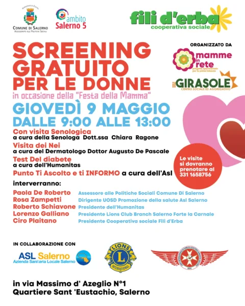 In occasione della Festa della Mamma, Giovedì 9 maggio, dalle ore 9:00 alle ore 13:00, ci sarà uno screening gratuito per le donne organizzato dalle associazioni 'Mamme in rete' e