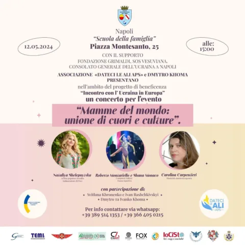 Ad organizzare l'iniziativa “Mamme del mondo: unione di cuori e culture”, l’associazione Dateci le Ali, insieme alla Fondazione Grimaldi, all’associazione SOS Vesuviana con l’alto patrocinio del Consolato Generale