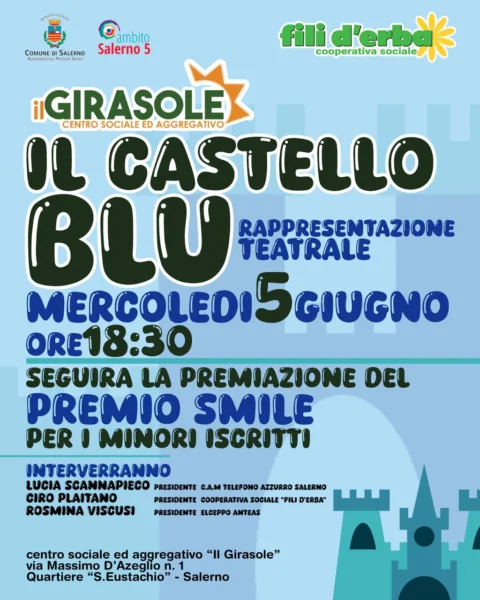 Mercoledì 5 giugno alle ore 18:30, il centro sociale ed aggregativo 'Il Girasole', proporrà la rappresentazione teatrale 'Il castello blu'. Successivamente ci sarà la premiazione per i piccoli iscritti, del