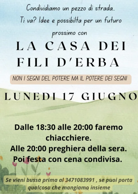 Lunedì 17 giugno dalle ore 18:30 alle ore 20:00, La Casa Dei Fili D'Erba, organizza un incontro ove ci saranno chiacchiere, preghiere e festa condividendo la cena. Per partecipare chiamare