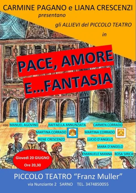 Giovedì 20 giugno alle ore 20:30 al PICCOLO TEATRO 'Franz Müller' in Via Nunziante 2 a Sarno, gli allievi del progetto 'PICCOLI...AL PICCOLO' presenteranno lo spettacolo PACE, AMORE E... FANTASIA