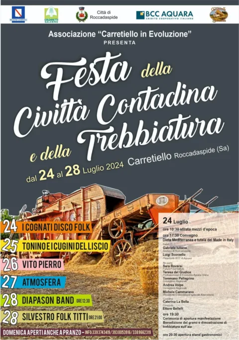 FESTA DELLA CIVILTA' E DELLA TREBBIATURA Dal 24 al 28 luglio a Carretiello in Roccadaspide ci sarà la festa della civiltà contadina e della trebbiatura, con musica e vari ospiti.