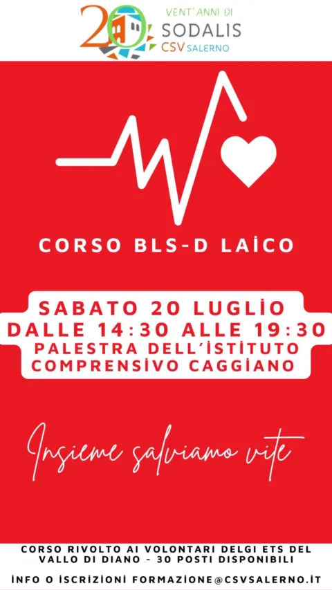 Sabato 20 luglio dalle 14.30 alle 19.30, nella palestra dell'Istituto Comprensivo a Caggiano, si terrà il corso BLS-D laico rivolto ai volontari degli Enti del Terzo settore del Vallo di