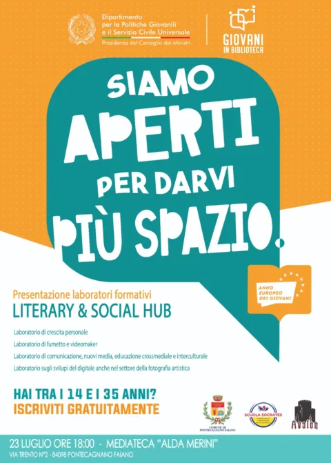 Aperto a Pontecagnano un nuovo spazio per i giovani che verrà presentato il 23 luglio alle ore 18:00, alla Mediateca 'Alda Merini' in Via Trento 2. In questo spazio sarà