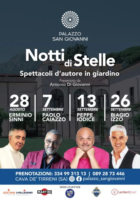 Saranno quattro appuntamenti imperdibili,quelli che propone “Palazzo S. Giovanni “di Cava de’ Tirreni da fine agosto a fine settembre. La rassegna “Notti di Stelle”,vedrà la presenza di artisti di chiara