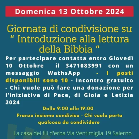 Domenica 13 Ottobre 2024 inizierà la giornata di condivisione su ''Introduzione alla lettura della Bibbia''. L'evento, organizzato dalla Casa dei fili d'erba, inizierà verso le 09:00 con la presentazioni della