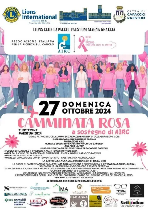 Il Lions Club Capaccio Paestum Magna Graecia, sotto la presidenza del Dott. Vincenzo Mallamaci, ha organizzato la “Camminata in Rosa”, un evento benefico a sostegno della ricerca sul cancro,