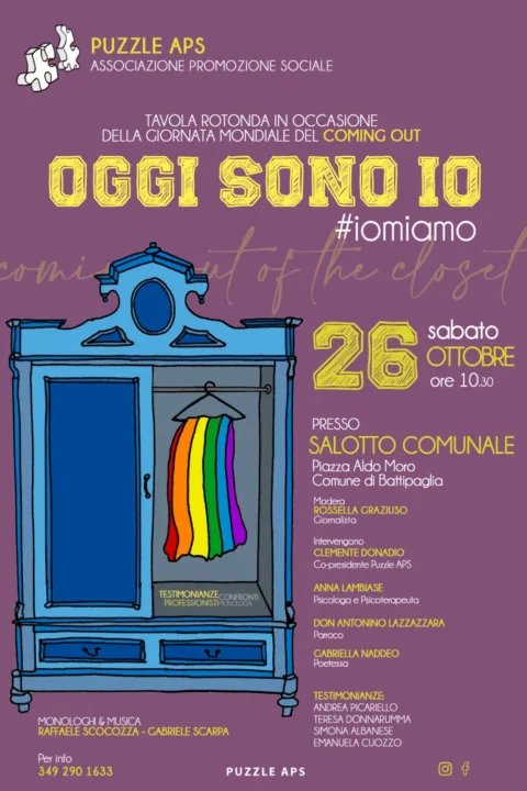 OGGI SONO IO - #IOMIAMO Tavola rotonda organizzato dalla Puzzle APS in occasione della Giornata Internazionale del Coming Out Sabato 26 Ottobre alle 10.30, presso il Salotto Comunale del Comune