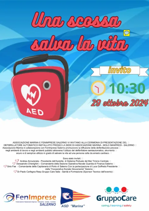 Un defibrillatore per i diportisti ai pontili del Molo Manfredia Salerno. Alla presentazione di martedì 29 ottobre ore 10,30 presso la sede dell’Ass. Marina di Molo Manfredi (adiacente la Stazione