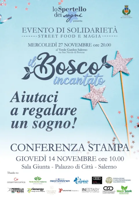 Domani, giovedì14 novembre, alle ore 10, in Sala Giunta, a Palazzo di Città, si terrà la conferenza stampa di presentazione dell’evento di solidarietà “Il bosco incantato”, organizzato da Lo Sportello