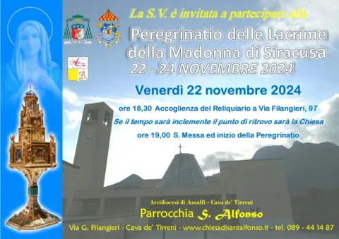 La Parrocchia S. Alfonso di Cava de' Tirreni annuncia la Peregrinatio del Reliquiario contenente le Lacrime della Madonna di Siracusa dal 22 al 24 novembre 2024. Ad accogliere la preziosa