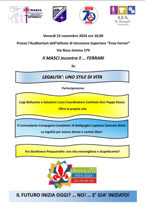Il M.A.S.C.I. (Movimento Adulti Scout Cattolici Italiani) festeggia il 70esimo della sua Fondazione avvenuta il 20 giugno 1954 presso la Domus Pacis in Roma. Il motto delle celebrazioni di questi
