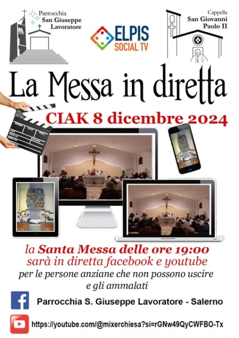 Domenica 8 dicembre 2924, solennità dell’Immacolata Concezione della Beata Vergine Maria, sarà possibile seguire, sulla pagina Facebook della Parrocchia S. Giuseppe Lavoratore - Salerno e all’indirizzo youtube https://youtube.com/@mixerchiesa?si=rGNw49QyCWFBO-Tx del canale