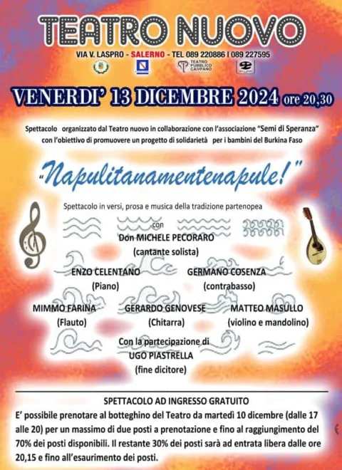 Venerdì prossimo, 13 dicembre, al teatro Nuovo di Salerno, concerto di Don Michele Pecoraro “Napulitanamentenapule” al teatro Nuovo che, insieme all’associazione “Semi di Speranza”, ha organizzato l’evento per sostenere progetti