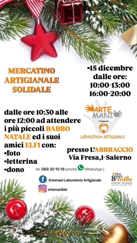 Il 15 dicembre dalle ore 10:00 ci sarà il Mercatino artigianale solidale del laboratorio "ARTEMANI" dell' associazione l'Abbraccio (Via Fresa, 1 San Leonardo). Sarà presente anche Babbo Natale e i