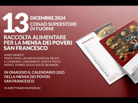 https://youtu.be/C0GJvOAQwzU Il 13 dicembre, organizzata da Ags Comunica una raccolta alimentare presso il CONAD Superstore di FUORNI, in Via delle Calabrie 4, per sensibilizzare la comunità e garantire un pasto