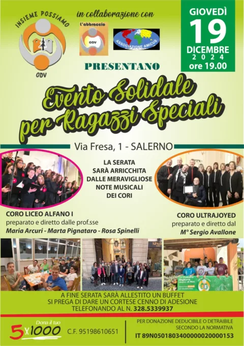 Organizzata dall’associazione Insieme Possiamo la serata, inizio alle 19, sarà un momento d’incontro con i ragazzi di insieme possiamo. Ad arricchire l’evento momneti musicali con il coro del liceo Alfano