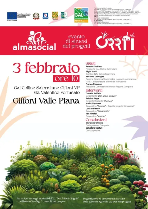 Uncategorized ALMASOCIAL e ORRTI Evento di sintesi dei progetti. Appuntamento lunedì prossimo 3 febbraio presso la sede del GAL Colline Salernitane, via Valentino Fortunato Giffoni Valle Piana, Lunedì prossimo 3 febbraio presso la sede del GAL Colline Salernitane, via Valentino Fortunato Giffoni Valle Piana, saranno illustrate le attività svolte nell'ambito dei progetti Almasocial e ORRTI, acronimo di Elpis Social TV1 anno faContinua a Leggere