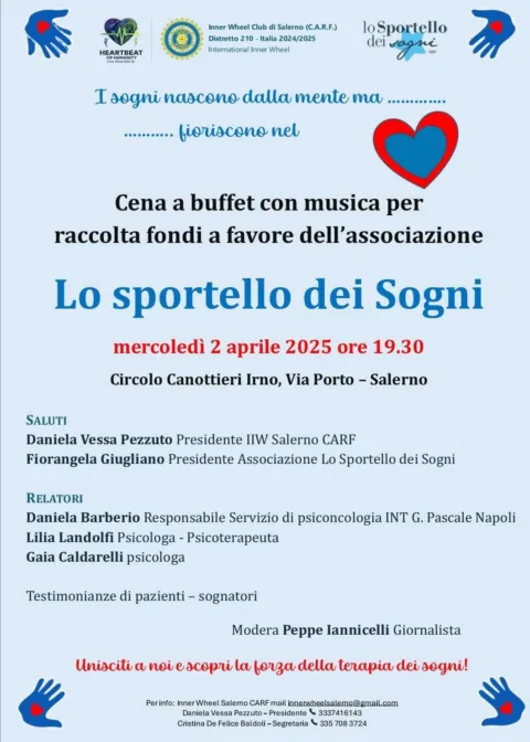 Mercoledì 2 aprile al Circolo Canottieri di via Porto a Salerno alle 19:30, ci sarà una serata dedicata ai Sogni, organizzata da Innerwheel Club Salerno per raccogliere fondi a favore