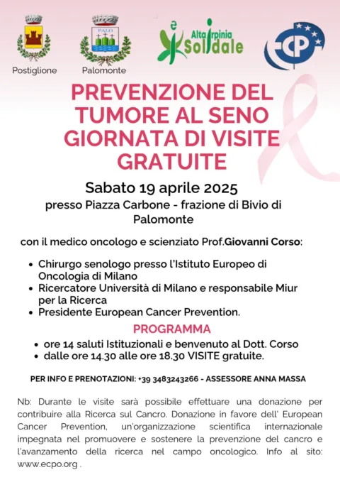 Sabato 19 aprile, a partire dalle ore 14 in piazza Umberto Carbone, in località Bivio di Palomonte, una giornata di visite di gratuite e di sensibilizzazione sulla prevenzione del tumore