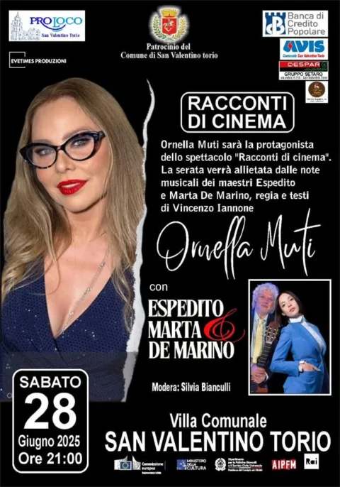 Sabato 28 giugno dalle ore 21:00 presso la Villa Comunale di San Valentino Torio ci sarà lo spettacolo “Racconti di cinema” che vede come protagonista l’attrice Ornella Muti. Uno spettacolo