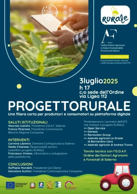 Giovedì 3 luglio alle ore 17 presso la sede dell’Ordine dei Dottori Agronomi e Forestali di Salerno sarà presentata la piattaforma digitale, realizzata nell’ambito del progetto RURALE del PSR Campania,