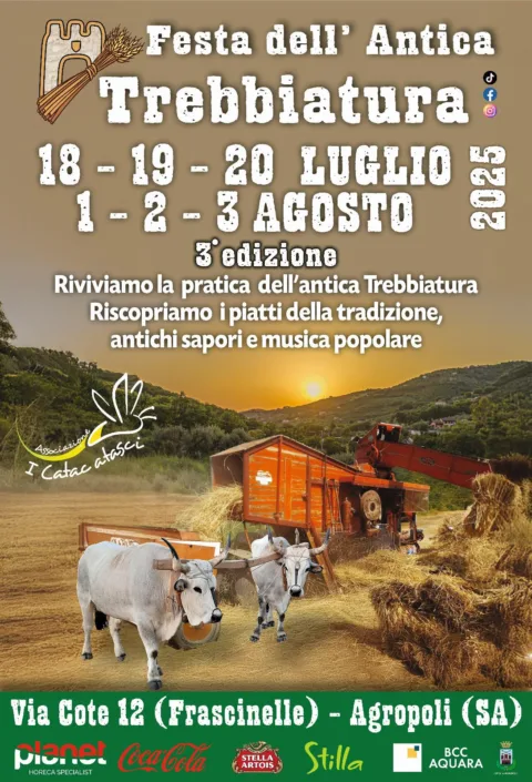I giorni 18, 19 e 20 luglio e 1, 2 e 3 agosto 2025, presso la località Frascinelle di Agropoli (SA)ci sarà la festa dell’Antica Trebbiatura per riscoprire le radici
