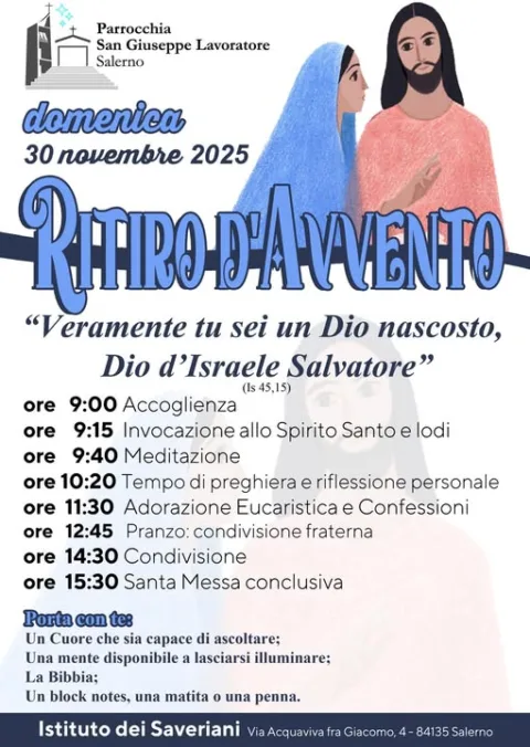 RITIRO D'AVVENTO Domenica 30 novembre dalle ore 9:00 sino alle 15:30, presso l'Istituto dei Saveriani (Salerno) ci sarà il Ritiro d'Avvento in preparazione per il Santo Natale.