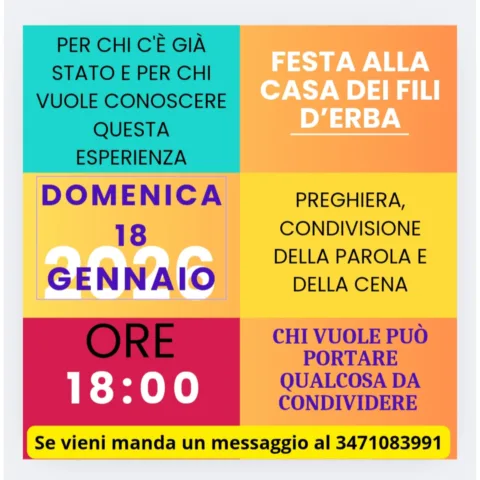 Domenica 18 gennaio alla Casa dei fili d’erba ci sarà una piccola festa per un momento di preghiera, per condividere parola e cena. Chi vuole partecipare, può portare qualcosa da