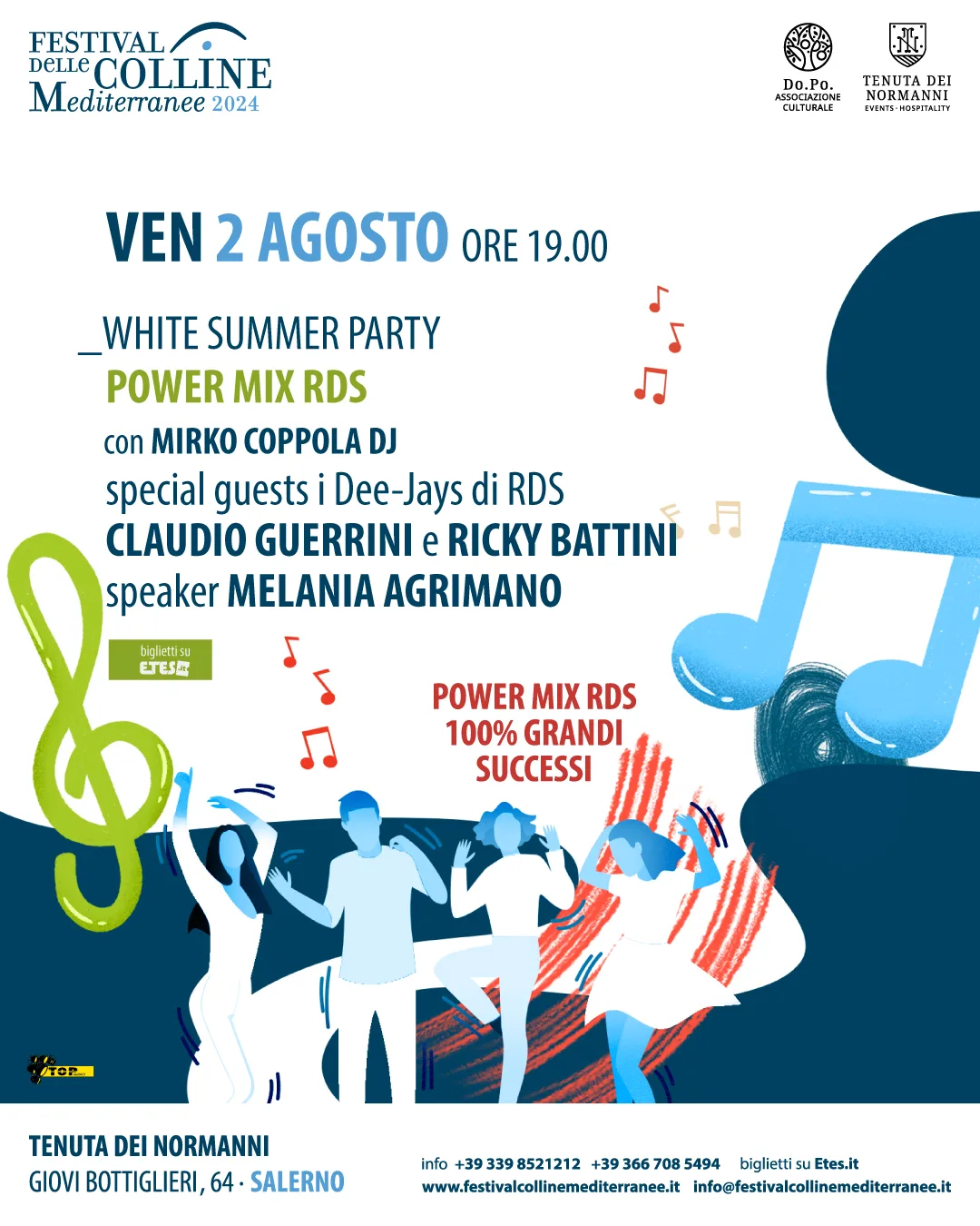 Alle ore 22 saranno alla console i celebri dee-jays di Radio RDS Claudio Guerrini e Ricky Battini, con la speaker Melania Agrimano, per far ballare tutti al ritmo delle grandi hit del momento e del passato. I biglietti sono disponibili su HYPERLINK “http://www.etes.it”www.etes.it o al botteghino d’ingresso con prenotazione ai numeri +39 339 8521212 – 366 708 5494.