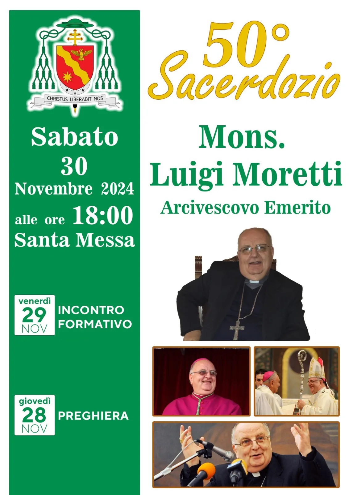Tre giorni di festeggiamenti per il 50esimo del sacerdozio dell’Arcivescovo Emerito di Salerno Mons. Luigi Moretti che Il 30 novembre 1974 fu ordinato presbitero, per la diocesi di Roma, dal cardinale vicario Ugo Poletti. Molti gli incarichi svolti da Monsignor Moretti che il 10 giugno del 2010 fu nominato arcivescovo metropolita di Salerno-Campagna-Acerno da Papa Benedetto XVI, succedendo a Monsignor Gerardo Pierro, dimessosi per raggiunti limiti di età, . Durante il suo episcopato in Campania, è stato delegato per i beni ecclesiastici e l’edilizia di culto della Conferenza episcopale campana. Monsignor Moretti ha rivestito la carica di Arcivescovo Metropolita di Salerno, Campagna Acerno fino al 18 dicembre 2018 quando, dopo una scelta ponderata, annunciò le sue dimissioni  per motivi di salute. Per celebrare i suoi 50 anni di Sacerdozio, il giorno 28 novembre prossimo, si terrà un momento di preghiera, il giorno successivo è previsto un incontro formativo e sabato 30 novembre, alle ore 18, la Santa Messa. A breve i dettagli informativi sulle diverse iniziative.