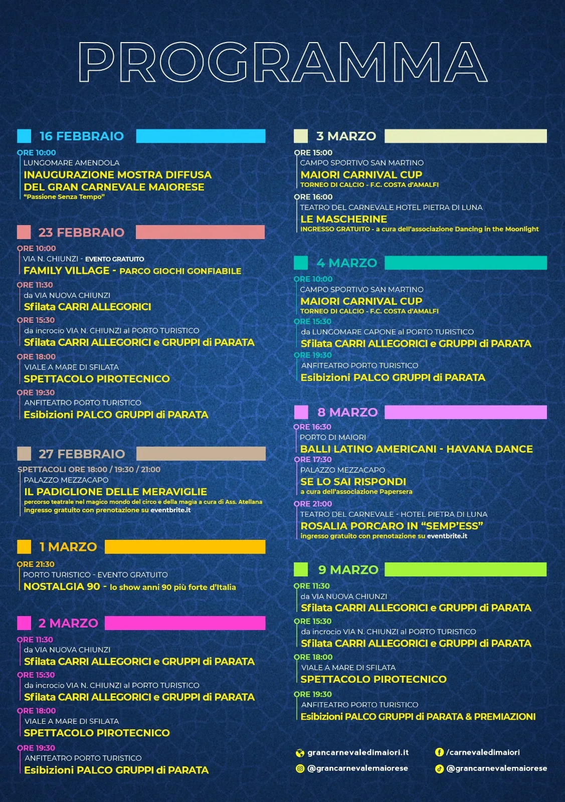 Dal 23 febbraio al 9 marzo dalle ore 15:30, quattro sfilate dei carri allegorici, spettacoli musicali, eventi culturali e iniziative per ragazzi animeranno l’evento. Tra le iniziative collaterali due imperdibili serate con Rosalia Porcaro e la Dance Anni 90 all’anfiteatro del Porto di Maiori.