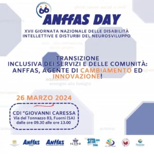 In occasione del 66° anniversario della fondazione di Anffas Nazionale e della XVII Giornata nazionale delle disabilità intellettive e dei disturbi del neurosviluppo, la Fondazione Anffas Salerno Giovanni Caressa Onlus spalancherà le porte all’inclusione sociale con l’Open Day Anffas dalle 9.30 alle 13.00 nella sua sede del quartiere Fuorni per accogliere familiari e amici, cittadini e studenti delle scuole superiori, per una giornata di inclusione e di cultura sul tema della disabilità.