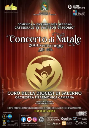 Domenica 14 Dicembre la Cattedrale Salerno “SS. Matteo e Gregorio” alle ore 20:00, ospiterà la dodicesima edizione del Concerto di Natale del Coro della Diocesi di Salerno e dell’Orchestra Filarmonica Campana.