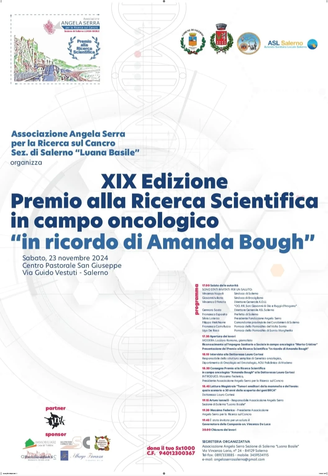 Il 23 novembre, alle ore 17, presso il Centro Pastorale San Giuseppe (via G. Vestuti) ci sarà la XIX edizione del premio alla Ricerca Scientifica in campo oncologico “in ricordo di Amanda Bough”,