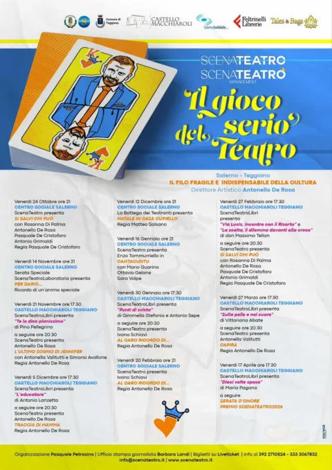 Venerdì 24 ottobre ore 21:00 presso l'Auditorium Centro Sociale di Salerno ci sarà la rassegna “Il Gioco Serio del Teatro – Il filo fragile e indispensabile della cultura” con la