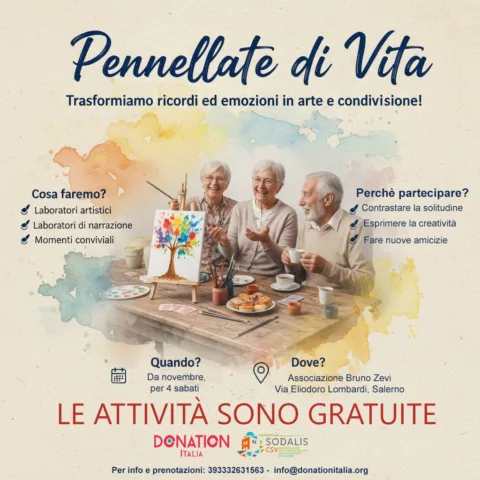 L’Associazione Donation Italia ETS, e Sodalis CSV Salerno, lanciano l’iniziativa “Pennellate di Vita: Trasformiamo ricordi ed emozioni in arte e condivisione!“. Questo ciclo di laboratori, che rientra nel programma dei Laboratori di Cittadinanza e