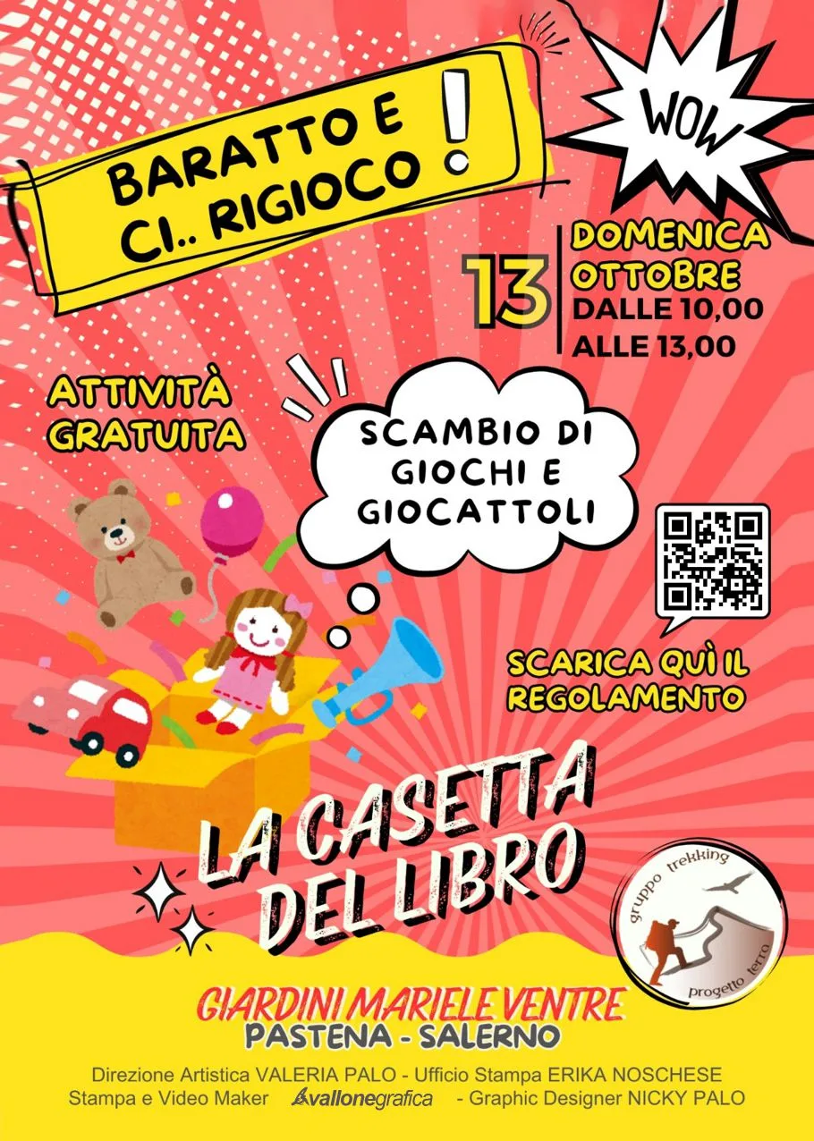 Baratto e…ci rigioco: è l’iniziativa promossa dall’Associazione Progetto Terra nell’ambito del Progetto “La Casetta del Libro”, in programma il prossimo 13 ottobre, dalle 10 alle 13 presso i Giardini Mariele Ventre nel quartiere Pastena e consiste in un vero e proprio baratto per bambini e ragazzi dai 6 ai 14 anni che avranno così la possibilità di portare giochi e giocattoli da scambiare. Successivamente, la Commissione di Valutazione, il cui giudizio è inappellabile, assegnerà ad ogni giocattolo un punteggio/valore; tale punteggio sarà un credito da utilizzare per lo scambio dei giochi spendibile nel corso della manifestazione. La partecipazione all’iniziativa implica l’accettazione incondizionata e integrale delle norme contenute nel presente regolamento: sarà consentito scambiare solo giochi e giocattoli; saranno accettati solo giochi e giocattoli di proprietà del bambino/ragazzo e destinati ai bambini/ragazzi nuovi o usati in buono stato ed in condizioni da non rappresentare pericolo per le persone. Il mercatino del baratto si propone come attività ricreativa, senza fini di lucro. «È una proposta per dare a bambini e ragazzi l’opportunità di scambiarsi oggetti che ormai non usano più, promuovere la socializzazione, la condivisione, la cultura dello scambio, del dono, del riciclo del vecchio affinché torni ad essere nuovo, favorire il riuso e il confronto dei gusti e degli interessi», ha spiegato la presidente dell’associazione Progetto Terra, Valeria Palo, Direttrice Artistica del Progetto La Casetta del Libro. La partecipazione è gratuita per tutti i bambini e i ragazzi dai 6 ai 14 anni; i minori dovranno essere accompagnati per tutta la durata dell’evento da un adulto, il quale ne manterrà la tutela e la responsabilità. Lo scambio avverrà nella forma del baratto o del dono. Non è consentito scambiare articoli per adulti, vestiti, generi alimentari, animali, qualsiasi oggetto reputato dagli organizzatori non attinente allo spirito e alle finalità del mercatino. «Lo spirito di questa manifestazione è basato fondamentalmente sull’amicizia, sul gioco e sulla socializzazione: qualsiasi comportamento scorretto, prepotente o inopportuno comporta la possibilità di allontanamento dal mercatino. È la prima edizione di “Baratto e Ci_Rigioco” a cura del Direttivo Tecnico costituito dalla mia Direzione Artistica, Avallone Grafic per la stampa e videomaker, Nicky Palo Graphic Designer ed Erika Noschese ufficio stampa. A loro tutti va la mia gratitudine e riconoscenza per il grande supporto professionale. Una prima edizione che speriamo di poter ripetere nel periodo natalizio con una piccola sorpresa per tutti i bambini ed in particolar modo per i piccoli pazienti della corsia Pediatrica dell’ospedale Ruggi D’Aragona di Salerno», ha aggiunto Valeria Palo.