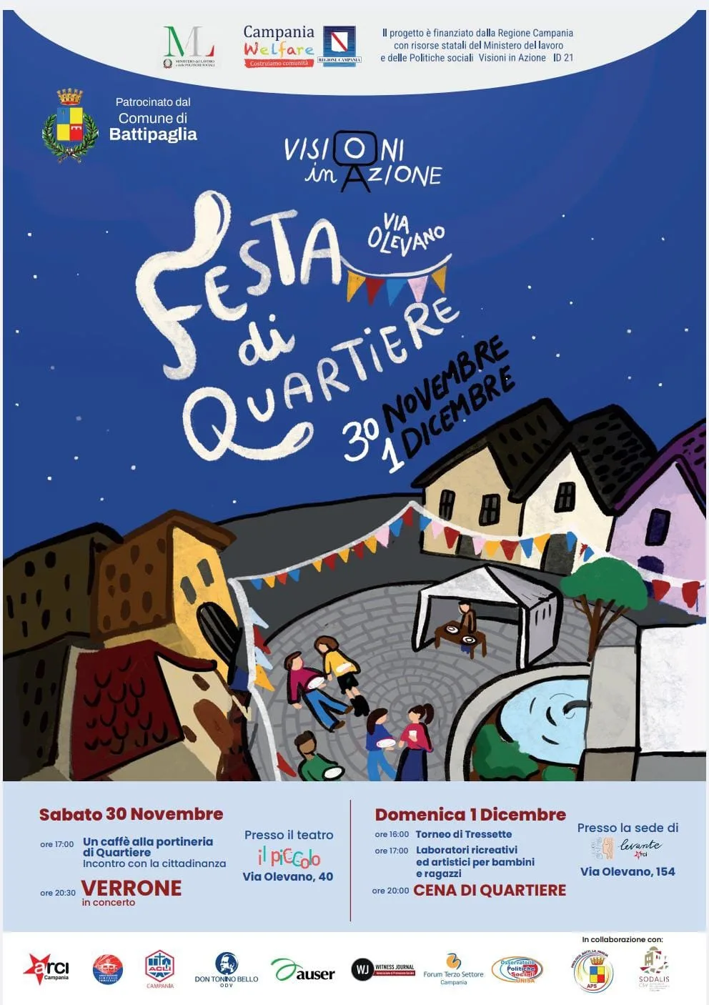 Visioni in Azione è un progetto che ha permesso all’ARCI Levante di entrare ancora di più in contatto con il quartiere di Battipaglia, conoscere nuove persone e raccogliere storie, aspettative, visioni per strutturare insieme una nuova idea di comunità.