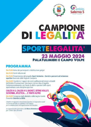 Giovedì 23 maggio, dalle ore 15, al Palatulimieri e al campo Volpe, ci sarà la seconda edizione dell’evento “Campione di Legalità”, con il coordinamento dell’assessorato alle Po­li­ti­che So­cia­li, in collaborazione con la Commissione Sport e con il gruppo Salerno per i Giovani.
