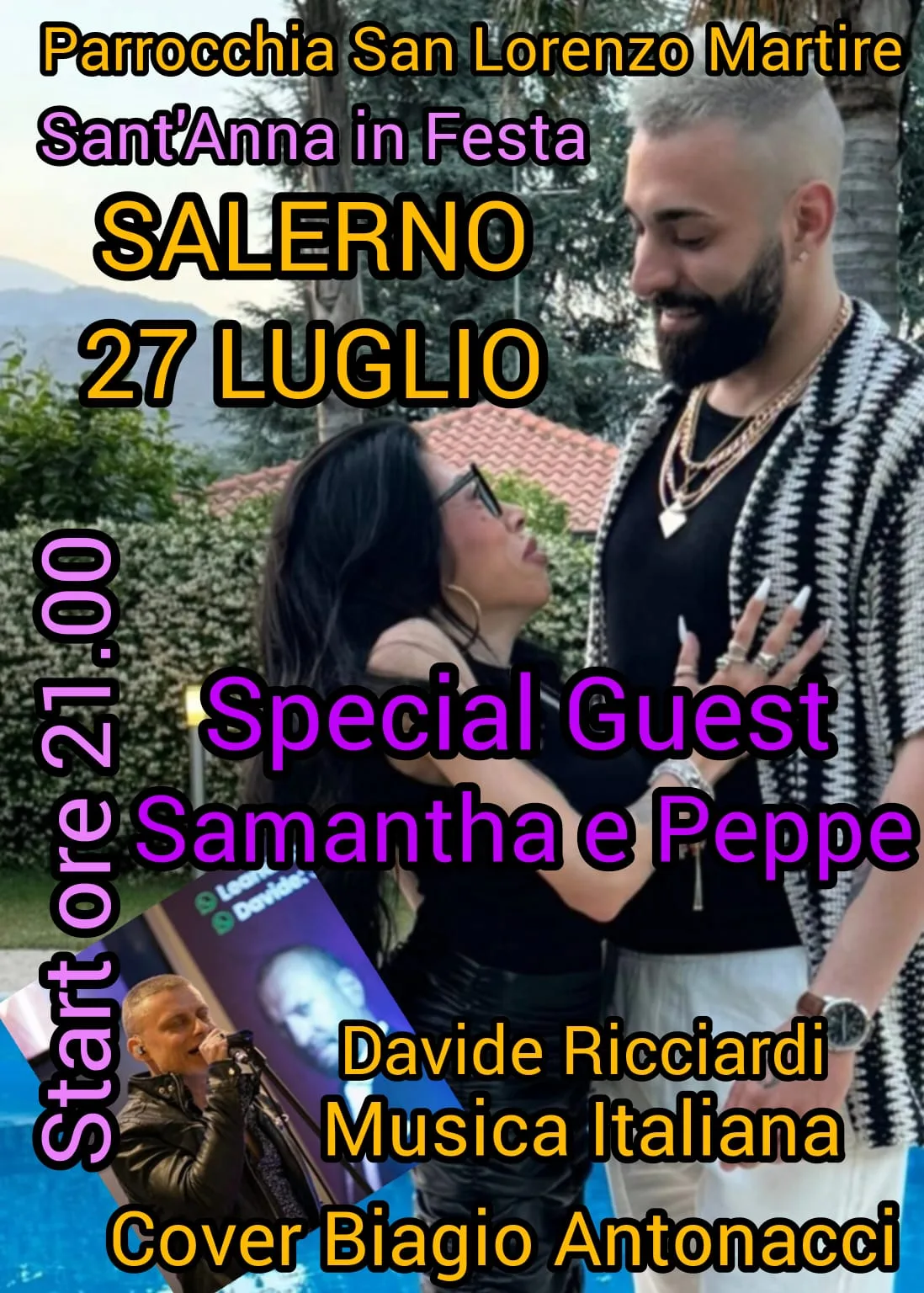 Dopo i festeggiamenti di oggi, in onore di Sant’Anna e San Gioacchino, domani, 27 luglio, nella Parrocchia di San Lorenzo Martire in Canalone di Salerno, ci sarà un concerto con le cover di Biagio Antonacci con Davide Ricciardi. Inizio alle ore 21:00, ospiti speciali della serata Samantha e Peppe.